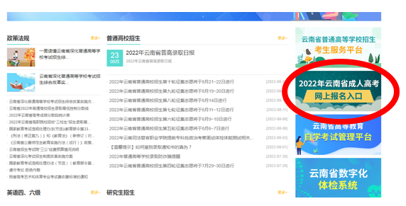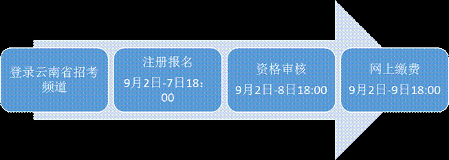 考生登录云南省招考频道(www.ynzs.cn)网站,通过“云南省成人高校招生考试网上报名系统”进行报名、填报志愿。所有参加全国统考的考生以及各类申请免试入学的人员,均须按时进行报名。逾期不再补办报名手续。